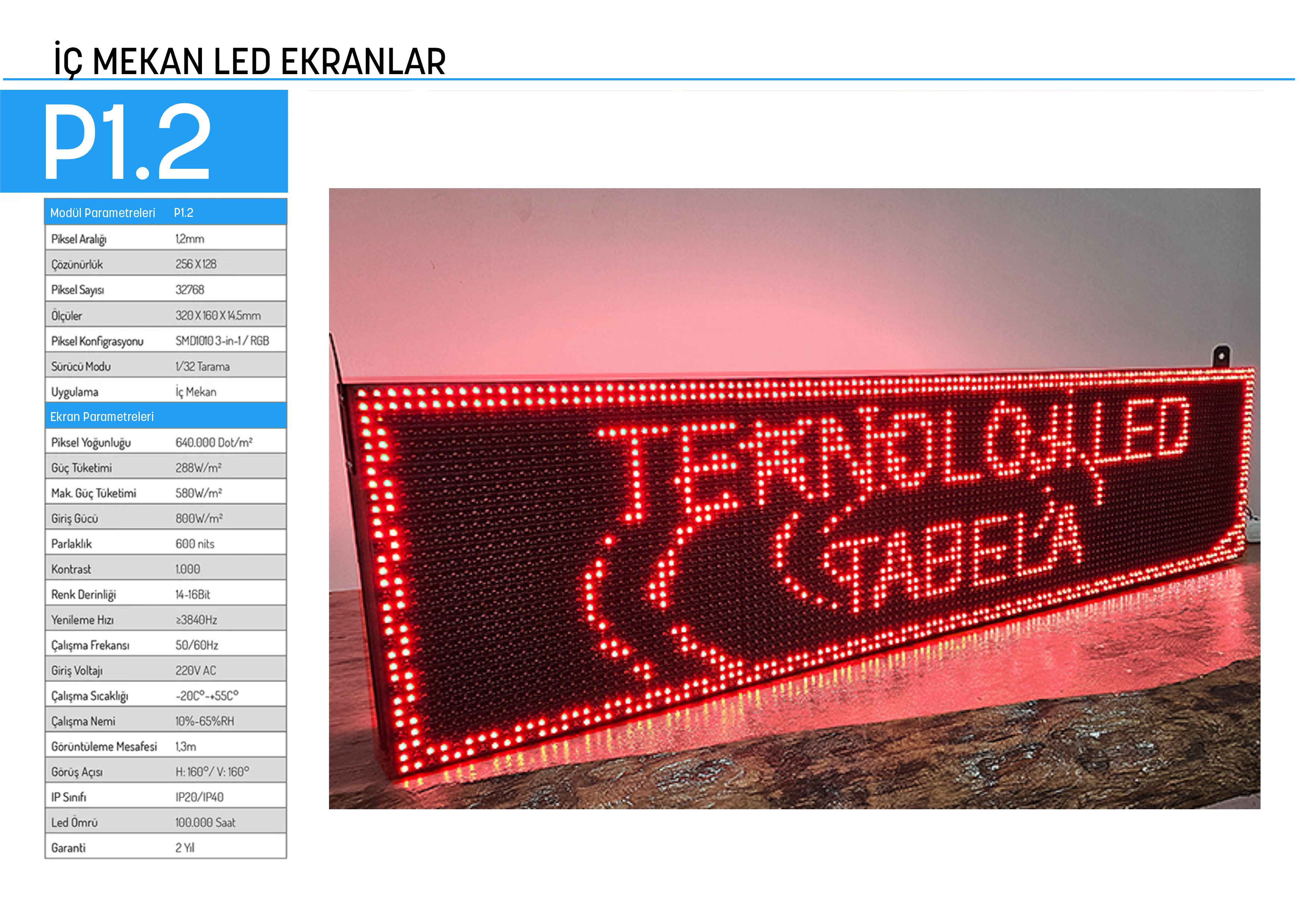 • P1.2: Piksel başına 1.2 mm mesafe ile en yüksek çözünürlüğü sunan bu ekranlar, genellikle yakın mesafeden izlenecek durumlarda tercih edilir. Müzeler, showroomlar ve kontrol odaları gibi ortamlarda kusursuz bir görüntü deneyimi sunar.