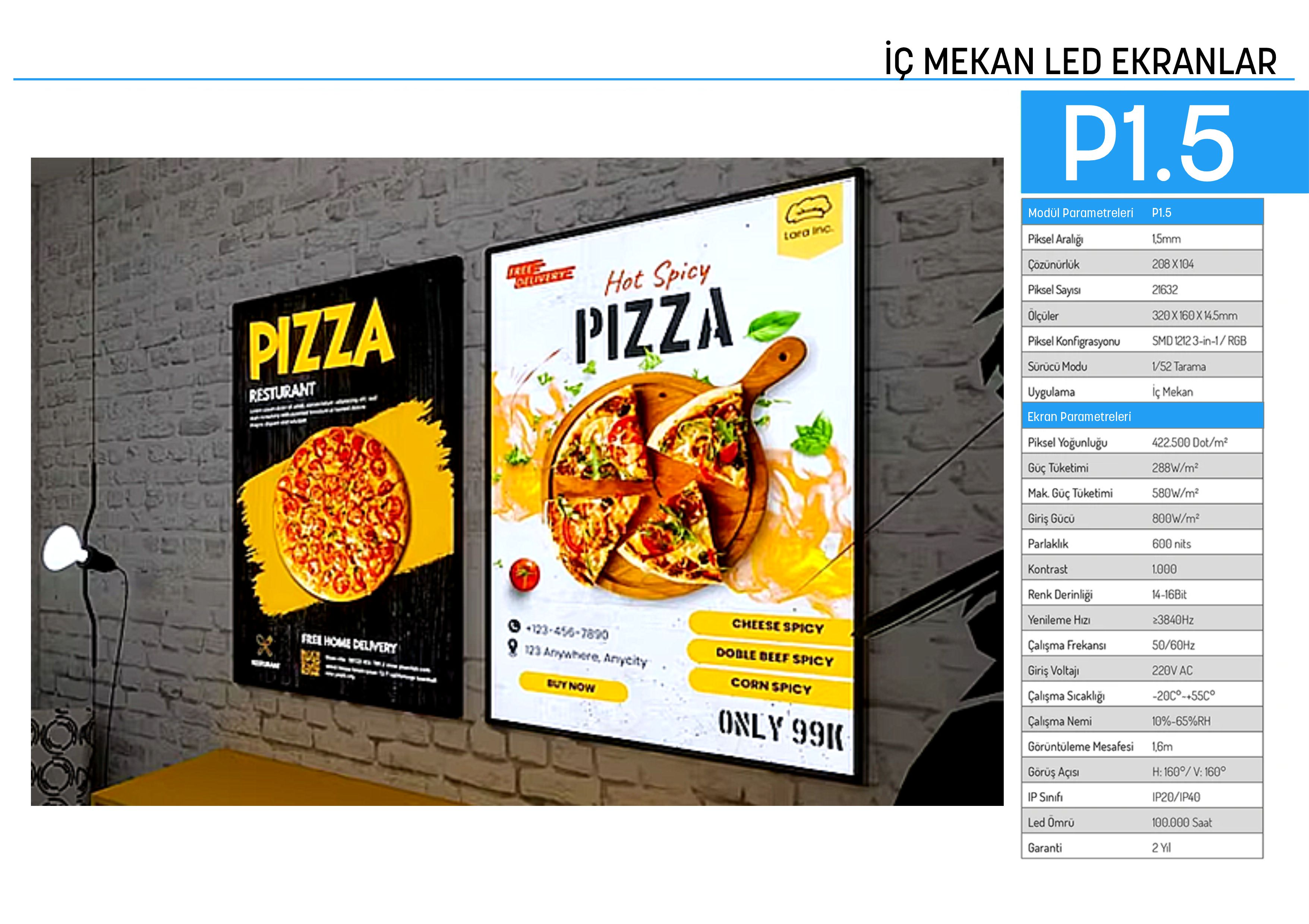 • P1.5: 1.5 mm piksel aralığı, yüksek çözünürlük ve canlı renkler ile dengeli bir performans sunar. Toplantı salonları, restoranlar ve mağazalar gibi ortamlarda sıklıkla kullanılır.