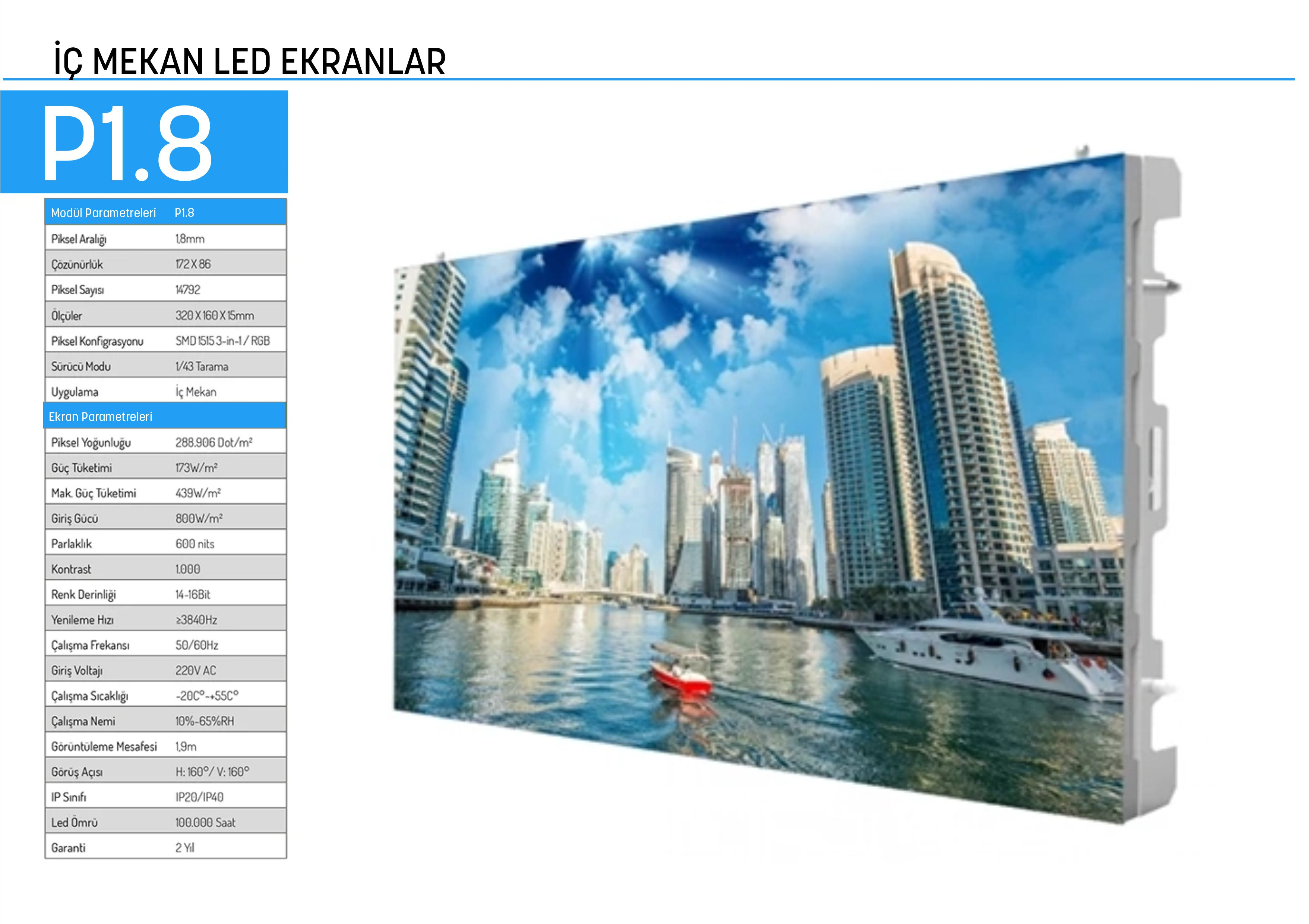 • P1.8: Daha geniş bir izleme açısına sahip olan bu ekranlar, orta büyüklükteki mekanlarda kullanıma uygundur. Alışveriş merkezleri, oteller ve fuar alanlarında etkili bir görsel iletişim sağlar.