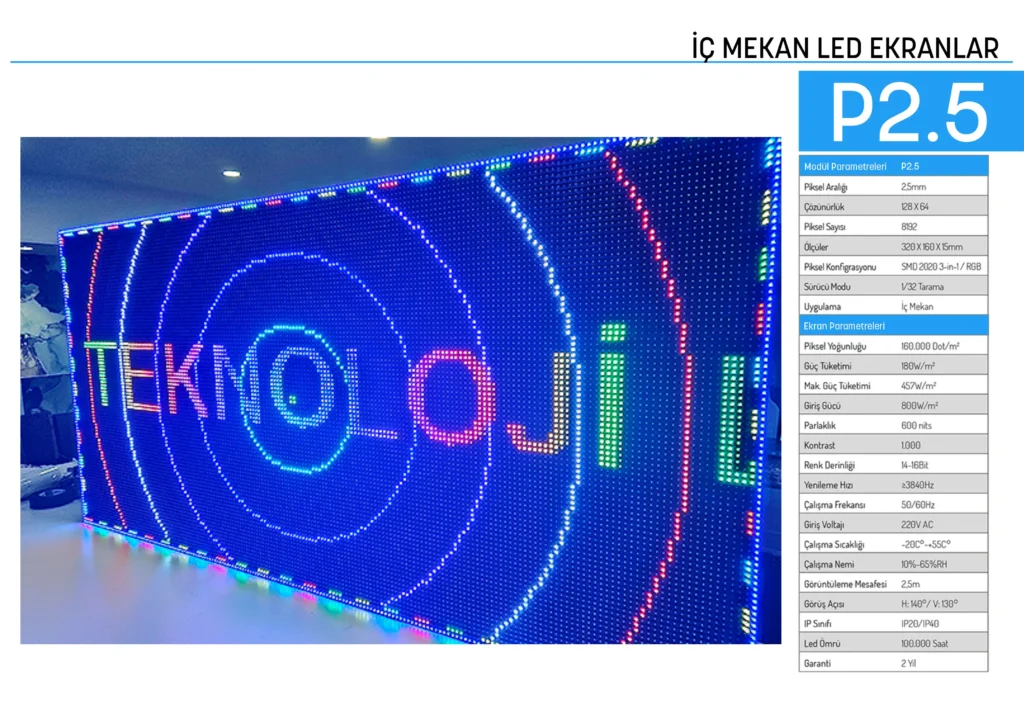 • P2.5: Daha büyük mekanlarda ve daha uzak mesafelerden izlenecek durumlarda tercih edilen bu ekranlar, ekonomik bir çözüm sunar. Spor salonları, stadyumlar ve konser salonlarında geniş kitlelere hitap eder.